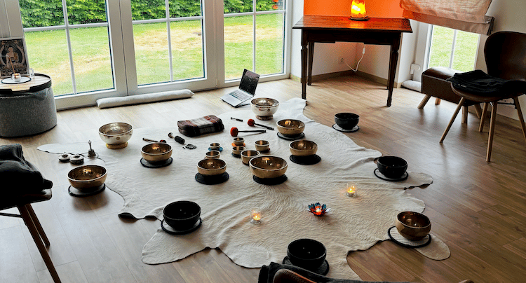 « La pratique sonore favorise le bien-être grâce aux fréquences vibratoires d'instruments traditionnels, notamment les gongs et les bols chantants himalayens. »